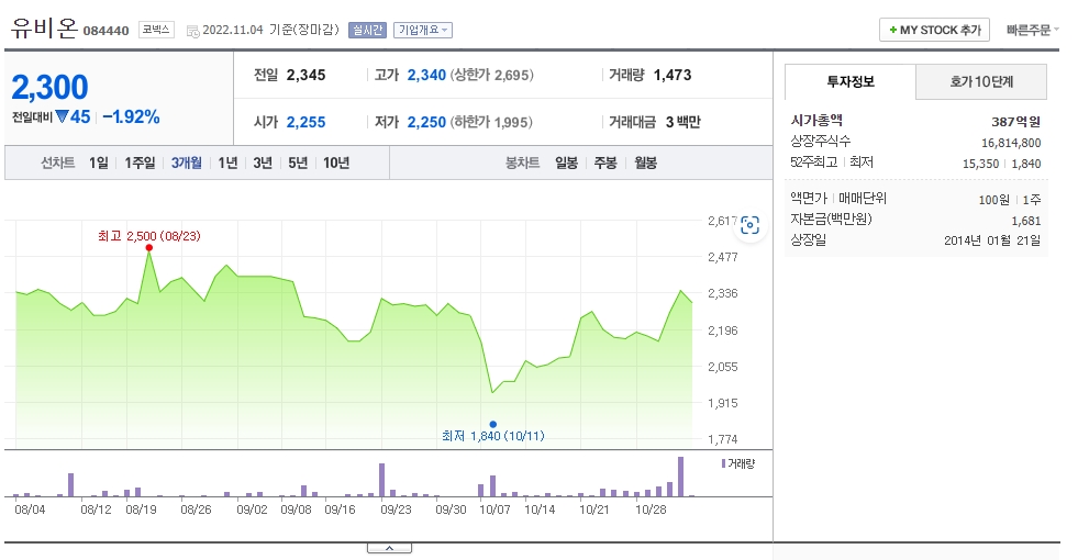 2022년 11월 4일 기준 코넥스 종가는